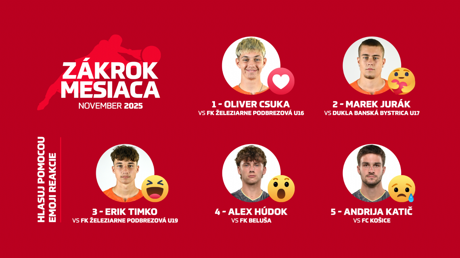 ASTV vám prináša aj v sezóne 2025/2026 pokračovanie ankety Zákrok mesiaca. Pozrite si päť najkrajších zákrokov za november v podaní brankárov AS Trenčín. V nominácii sú Oliver Csuka (U16), Marek Jurák (U17), Erik Timko (U19), Alex Húdok (U19) a Andrija Katič (A-tím). Hlasovať môžete na facebookovom profile klubu. Z hlasujúcich vyberieme jedného z fanúšikov našej hlavnej sociálnej siete, ktorý získa dve vstupenky na zápas Niké ligy.